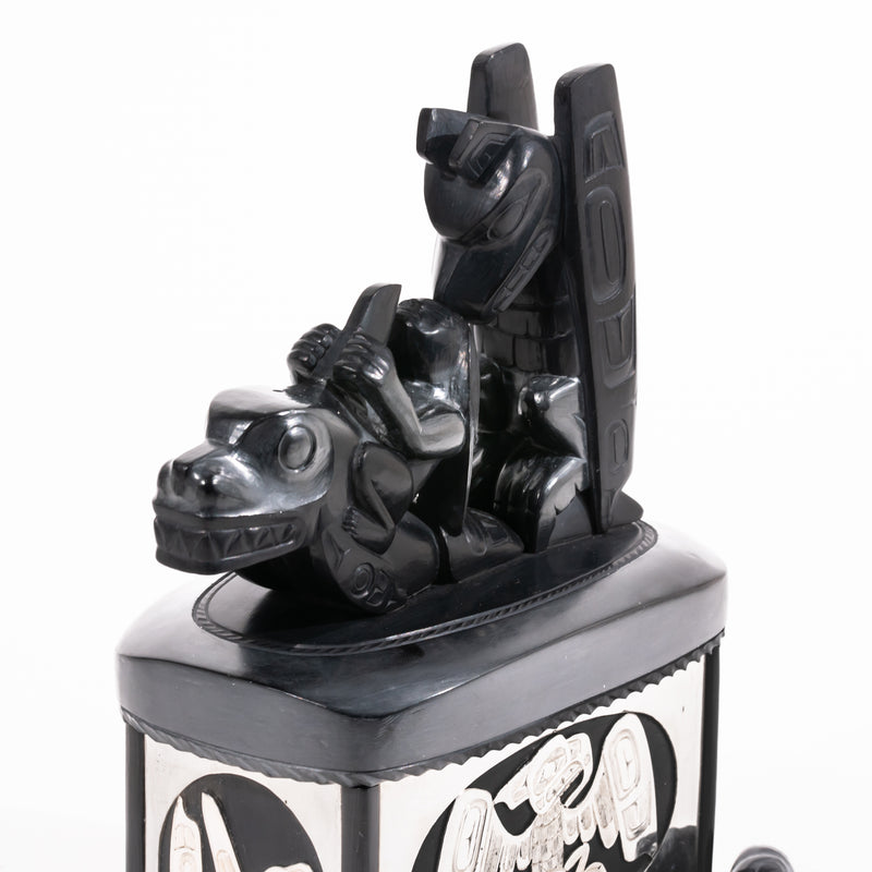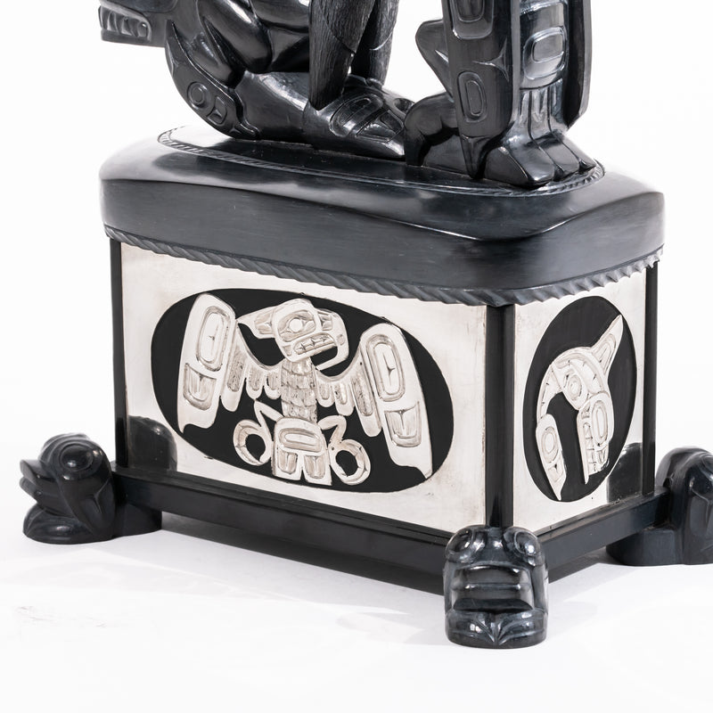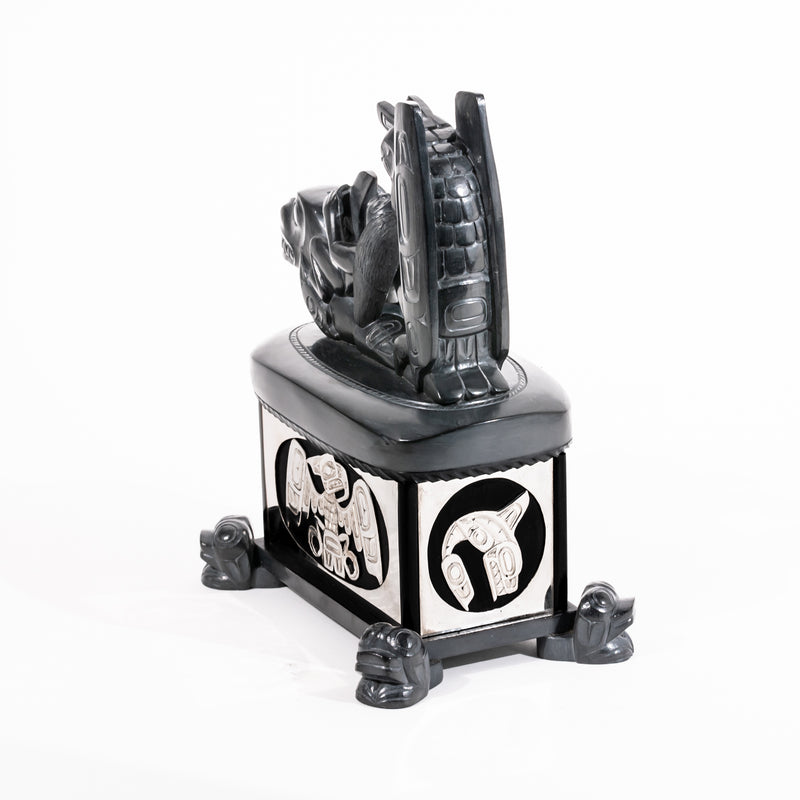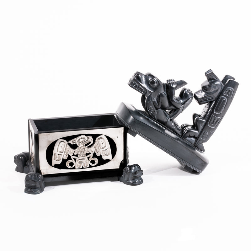 A rare and meaningful work, this box stands as a striking example of Haida argillite carving and contemporary expression rooted in cultural knowledge.