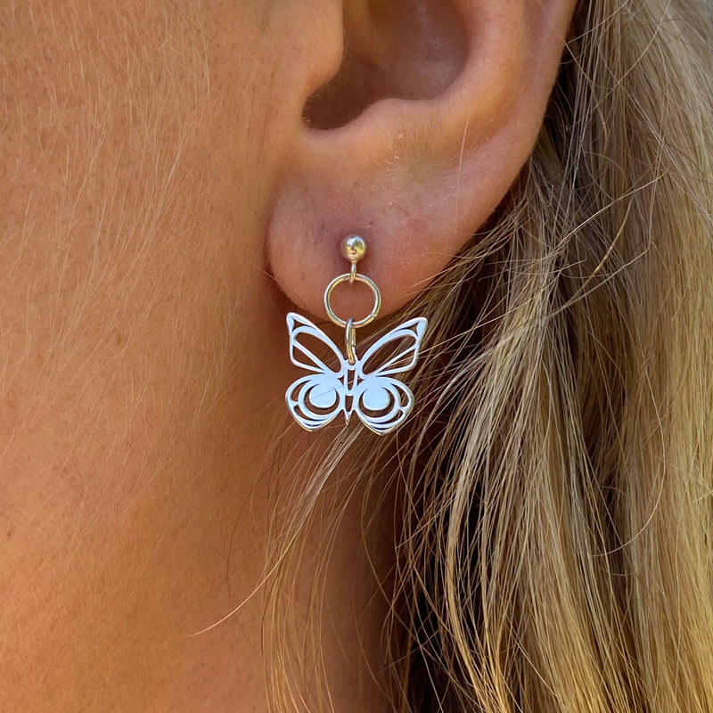 These butterfly studs are designed by Ts'msyen artist Morgan Asoyuf. Their lightness and delicate design floats in spirit.